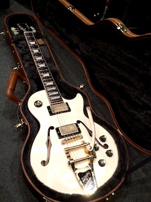 レスポールの形をしたセミアコ。見た目からして珍しいというか全く新しいコンセプトのギターで、海外では既にレニークラヴィッツなどが使用しているそうです。