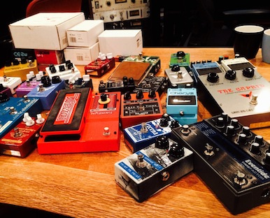 レコーディング中のギターとエフェクター。何気に後ろにある赤のマエストロアームの355もお気に入りです。