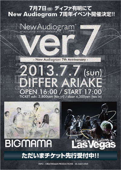 7月7日に東京ディファ有明で開催されるNew Audiogramの7周年イヴェント "New Audiogram ver.7 -New Audiogram 7th Anniversary-" にBIGMAMAの出演が決定!!