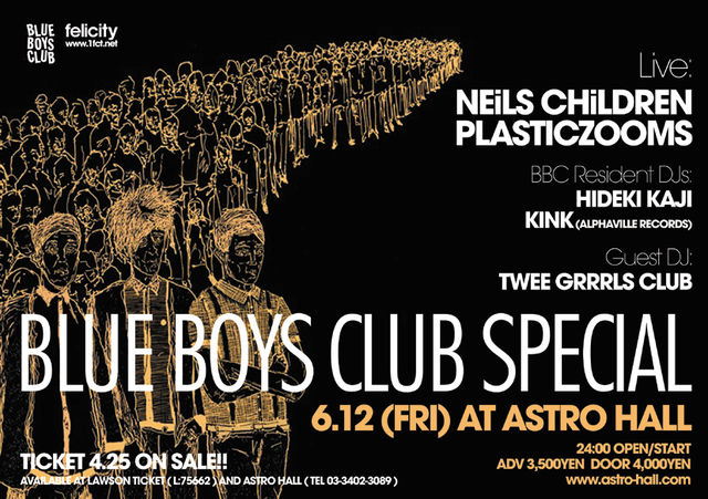 「好きだったロンドンのクラブ・イベントのような」をテーマにカジヒデキがオーガナイズしているパーティ"BLUE BOYS CLUB"。今回のゲスト・ライヴはUKのネオ・ゴス・シーンにおける最重要バンドNEiLS CHiLDREN。迎え撃つは日本のバンドでありながら忠実にUKのゴス・シーンのエッセンスをもち、カジヒデキのプロデュースで1stアルバムをリリースする話題の5人組、PLASTICZOOMS!! 日英のゴシック対決となりそうなこの夜を盛り上げるのは、意外にも(!?)ゴスを愛してやまないカジヒデキに、ALPHAVILLE RECORDSのレーベルオーナーKINK、さらにゲストDJにはRIOT & DIY精神を掲げるガールズDJチームTwee Grrrls Clubが登場!! 東京のクラブ・カルチャーを黒く盛り上げるイベントになりそうだ。