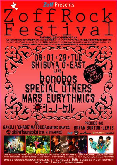 Zoff Rock Festival 2008.1.29 (tue) Shibuya O-EAST OPEN : 17:30 Zoffが贈る、注目バンド競演の冬フェス!FUJI ROCK FETIVAL'06への準協賛や、MTV「ロック検定」の協賛、ルーキーバンドのバックアップなど、メガネを通じて音楽の興奮と喜びを伝えてきたアイウエア・ブランド"Zoff"が、ついにライブイベントを開催!Zoffがスポンサードする76.1InterFMのプログラム「SUPER FESTIVAL」の人気コーナー「ZoffRock」と連動し、かつてない組み合わせによって新たな音楽体験を巻き起こす、Zoff Rock Festival始動! |