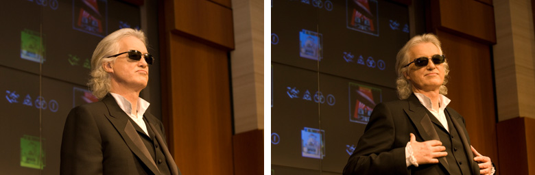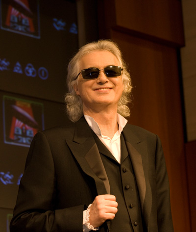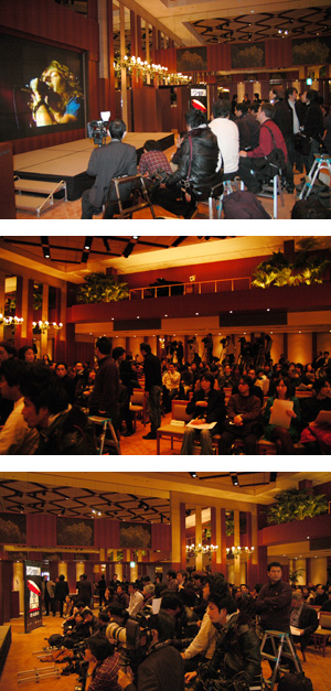 1月28日月曜日、記者会見の行なわれる場所は新宿にあるパーク・ハイアットの39階ボールルーム。天井は高く、シャンデリアが吊り下げられ、正面には160インチのマルチ・スクリーンがあり、ツェッペリンのライヴ映像が流されている。こんな記者会見がない限り、くることはないであろう場所だ。記者会見の開始予定時間は14:00。New Audiogram取材チームは2時間も前から会場入りし、かなりの気合いをみせるが、見事に空回りし、忘れ物をしたことに気付き慌てて戻ることに…。そして記者会見開始30分前、会場に戻るとすでに様々なメディアの記者とカメラマンが集まっていた。カメラマンたちは早くから入って、撮影のベスト・ポジションを確保していたようだ。記者席に着き、14:00を過ぎたところで記者会見が始まる。 司会者の声に導かれ、ジミー・ペイジ登場!いきなりものすごい数のシャッター音が鳴り響く。「スゲー!ホンモノだ!」と思っている間に5分程度の写真撮影も終わり、質疑応答へ。 まずは司会者による代表質問からスタート。