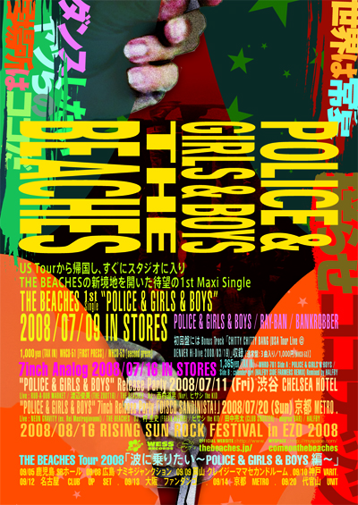 「波に乗りたい〜POLICE & GIRLS & BOYS編〜」 7月にニュー・シングル『POLICE & GIRLS & BOYS』をリリースしたTHE BEACHES! 9月より、そのシングルを引っさげての全国ツアー"THE BEACHES Tour 2008「波に乗りたい〜POLICE & GIRLS & BOYS編〜」"を開催! この特設ページを見て、ツアー会場にいくといいコトがあるかも!? 詳しくは下記をチェック!! 2008.9.5 (fri) Kagoshima SR HALL, Kagoshima |