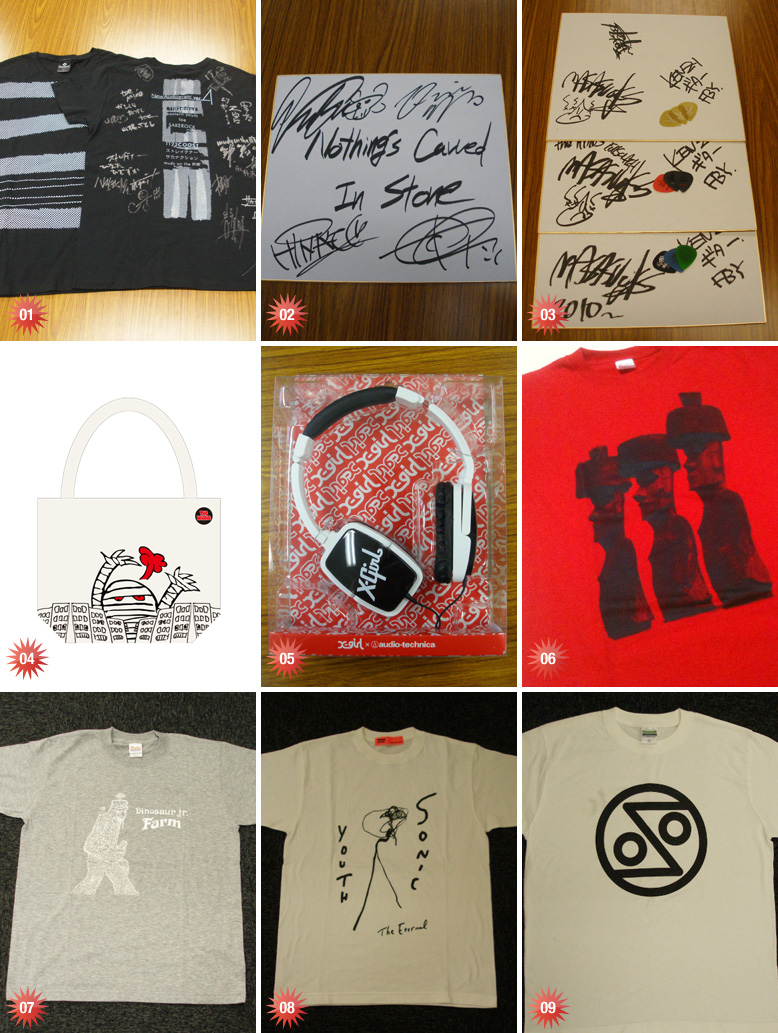 "ver.4 -1102east-"に出演してくれたeastern youth、toe、SAKEROCK、さらに"ver.4 -1123coast-"に出演してくれたストレイテナー、サカナクション、mudy on the 昨晩(OPENING ACT)、6組すべてのメンバーのサインが入ったイヴェントTシャツを抽選で2名様にプレゼント!! (02) 12月22日に最新ライヴDVD『Time of Justice』をリリースしたNothing's Carved In Stoneのメンバー全員サイン入り色紙を抽選で1名様にプレゼント!! (03) 現在公開中、『ギタリスト酔いどれ忘年会』に登場いただきましたKENZI MASUBUCHI(FRONTIER BACKYARD)、KOHKI(BRAHMAN)、masasucks(the HIATUS / FULLSCRATCH)3人の全員サイン入り色紙と使用済みギター・ピックのセットを抽選で3名様にプレゼント!! (04) 来年3月からは全国ワンマン・ツアー"We are the fuck'n World 〜第一章、夢の印税生活篇、完〜"もスタートするThe Mirrazのサイン入りトートバッグを抽選で1名様にプレゼント。画像のデザインのバッグにメンバーのサインが入ります(提供:KINOI RECORDS)!! (05) New Audiogramプロデュース "X-girl × audio-technica" ヘッドフォンを抽選で1名様にプレゼント!! (06) 今年20周年を迎え、新作『LOVE TRIO』や来年リリースされる豪華トリビュート盤『Re:TTLE CREATURES』など様々な話題を振りまいているLITTLE CREATURES。彼らの20周年記念ライヴのために(出演者用に)作ったという激レアTシャツを抽選で1名様にプレゼント!!(提供:TONE) (07) オリジナル・メンバー3人でのレコーディングも大きな話題となった、Dinosaur Jr.が昨年リリースした傑作アルバム『FARM』のTシャツ(Sサイズ)を抽選で1名様にプレゼント(提供:HOSTESS)!! (08) 81年の結成以来、アート・パンク、グランジ、オルタナティヴ・ロック・ムーヴメントに絶大な影響を与え、いまだ精力的な活動を続ける偉大なる先人、SONIC YOUTHが09年にリリースしたアルバム『The Eternal』のTシャツ(Sサイズ)を抽選で1名様にプレゼント(提供:HOSTESS)!! (09) ロサンゼルスを拠点にする強力ジャム・セッション軍団、Ozomatliのロゴ・マークがどどーんと入ったTシャツ(Mサイズ)を抽選で1名様にプレゼント(提供:HOSTESS)!! |