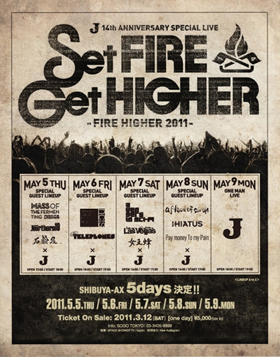 5月5日からいよいよ幕を開ける"J 14th ANNIVERSARY SPECIAL LIVE Set FIRE Get HIGHER -FIRE HIGHER 2011-"。その開催に先駆け、なんとJ本人からこのイヴェントにかける想いや意気込みを熱く語った最新インタヴューが到着!! 彼からのメッセージを受け取り、最高のテンションでイヴェントに足を運んでいただきたい!!