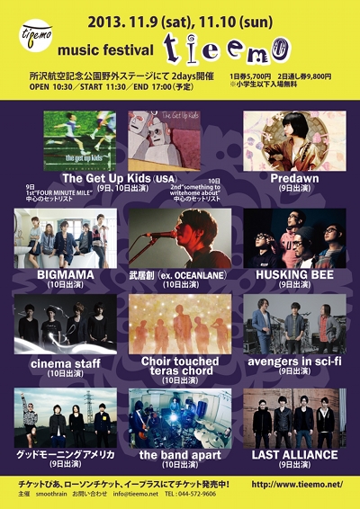 日本屈指のインディーズレーベルUK PROJECT内のRK-recordsは過去に「onsa」、現在では「静カニ潜ム日々」「asobius」などを輩出し、emoの自治権を獲得した。ヴァイオリンを擁するエモ/メロディックバンドであるBIGMAMAは[Champagne]と共に現在、RX-recordsだけでなくUK PROJECTの2大看板アーティストになったと言っても過言でもない。The Get Up Kids来日公演に足を運ぶメンバーもいるほどThe Get Up Kids好きな彼らが、music festival “tieemo”にてついに共演が実現!金井政人(Vo,Gt)が創り出す叙情的な歌詞の世界や、エモーショナルなライブパフォーマンスはBIGMAMAならではの魅力といえるだろう。2012年3月TOKYO DOME CITY HALLでの公演は、金井政人が“泣き虫王子”と呼ばれる所以となった一夜である。彼が喉の病状悪化のため歌えなかった際に流したあの時の涙は「届けたい」という強い想いによるものだったと思われる。“tieemo”では、オーディエンス、また金井自身にどのような感動の涙が待ち受けている事であろうか。