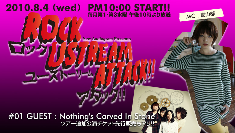New AudiogramによるUSTREAMプログラム『ROCK USTREAM ATTACK!!』がいよいよスタート!! 毎回ゲストにミュージシャンを招き、お酒を飲みながらゆる~いトークを繰り広げます。司会はモデル・タレントの高山都。ロック好きの彼女ならでは切り口でゲストに迫ります。もちろんTwitter連動で視聴者からの質問もリアルタイムで受付!! 生放送だけにナニが起こるかわからないこの番組、ゼッタイに見逃せません!!